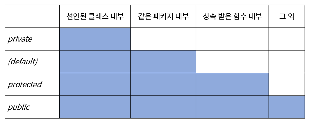 Java는 private, (default), protected, public 4종류의 접근 제어자가 있다.