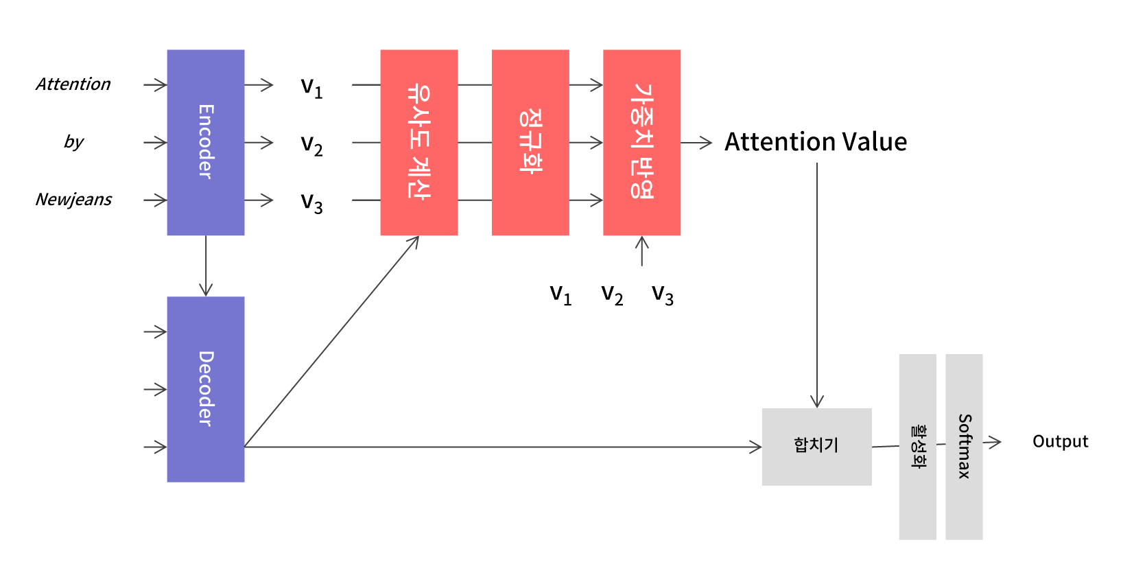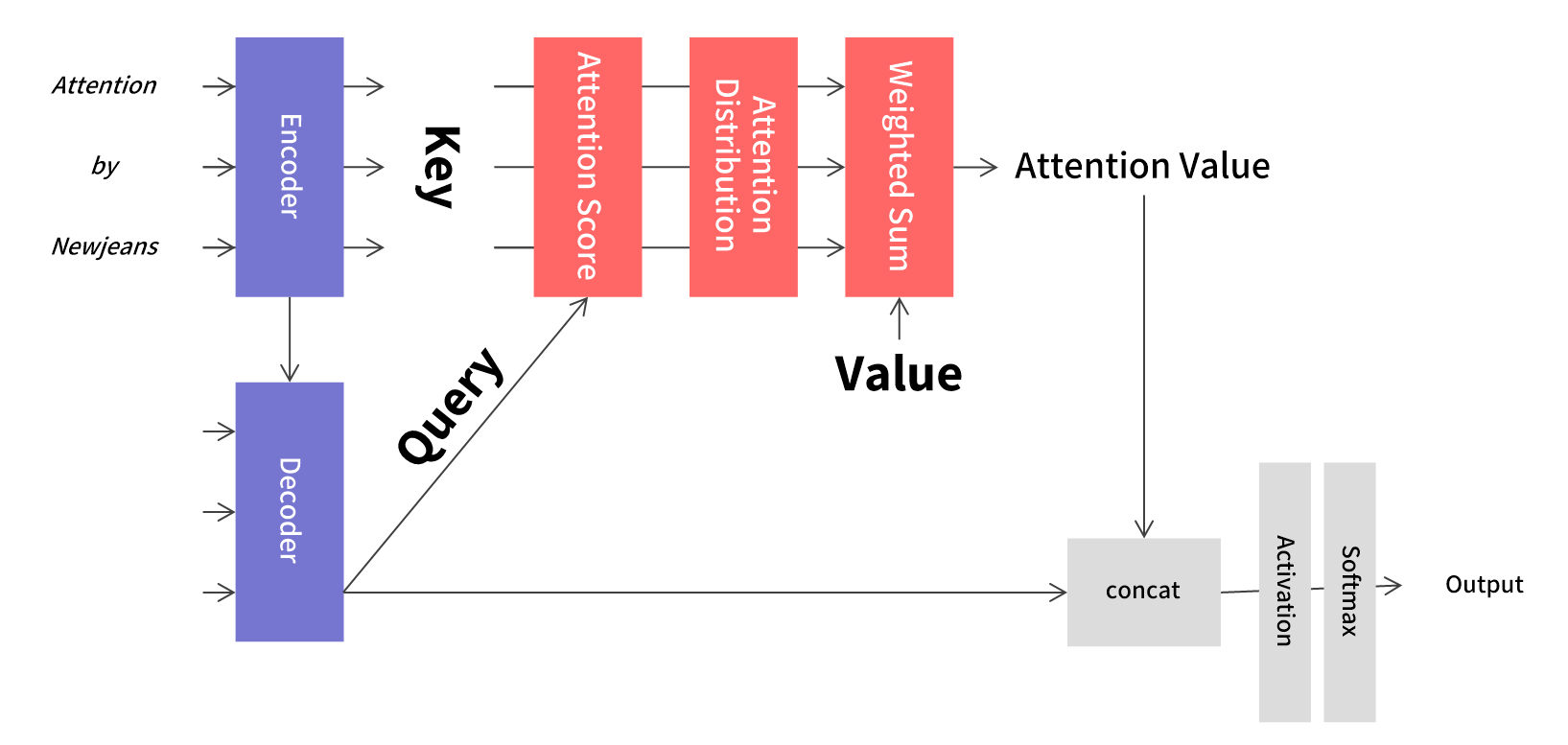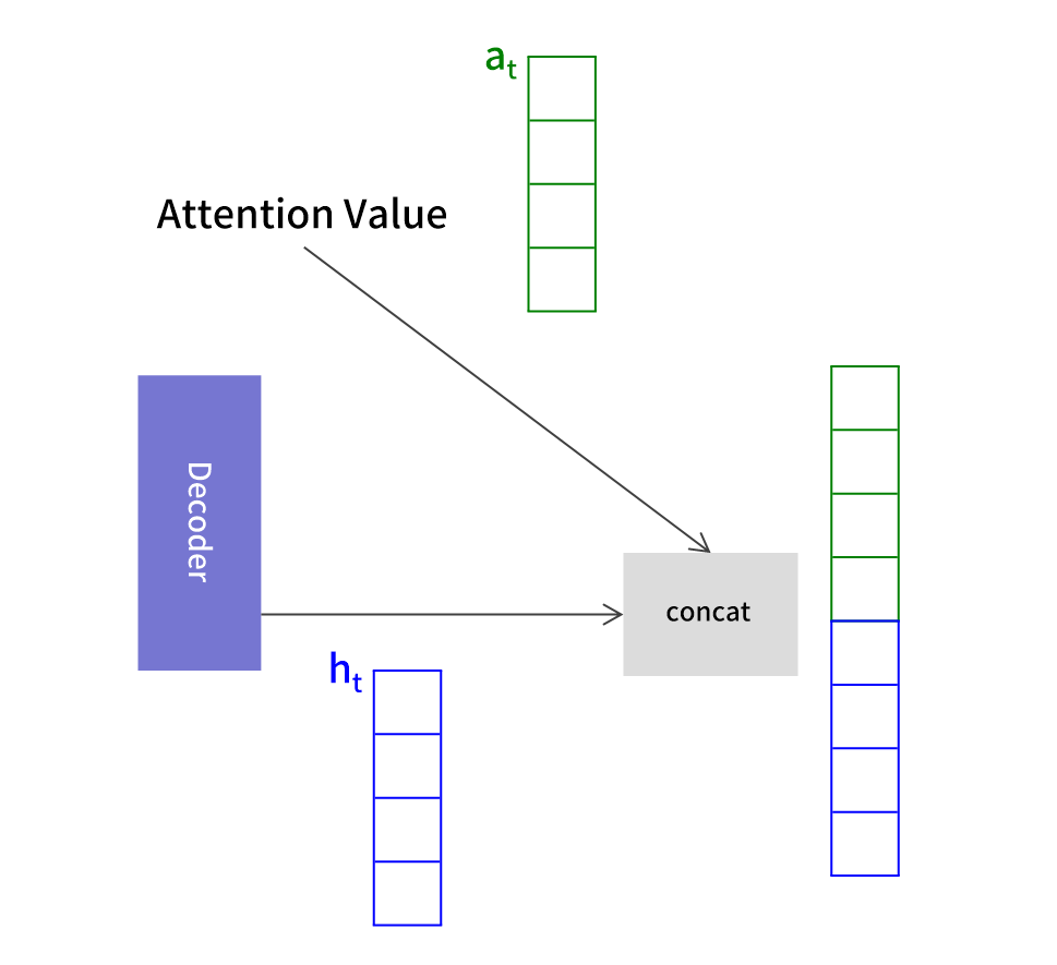 - 가중치가 반영된 Attention Value와 Decoder 출력을 합쳐 출력층으로 보낸다.