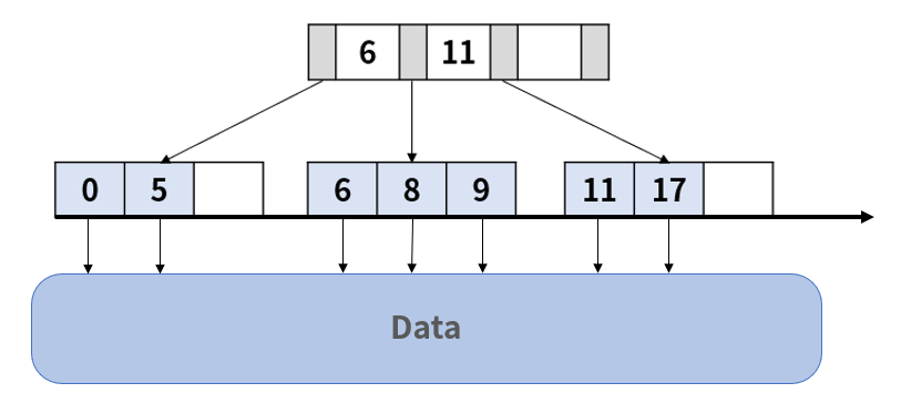 - Leaf 노드는 연결 리스트로 연결된 선형 구조를 가진다. 0 → 5 → 6 → 8 → ...
