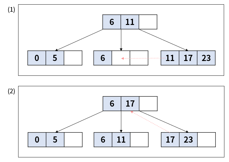 - 하나의 노드는 반드시 (fanout / 2)개 이상의 값을 가져야한다.