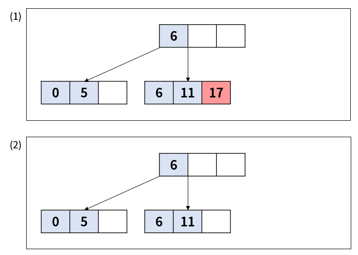 - 하나의 노드에 저장할 수 있는 최대 인덱스 개수를 fanout이라고 한다. 위 그림은 fanout이 4이다.