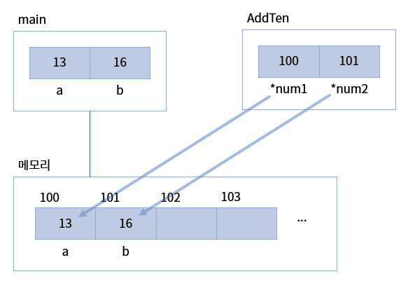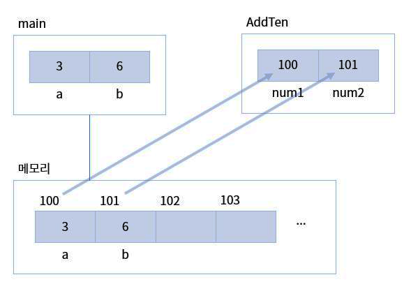 함수에 변수들의 값을 복사해 주는 것이 아니라 변수에 접근할 수 있는 주소 정보를 전달하는 것이다.