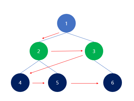 위 그림에서 파랑 노드를 먼저 탐색한 후, 파랑 노드의 자식 노드인 초록 노드를 모두 탐색한다. 그리고 초록 노드의 자식 노드인 남색 노드를 모두 탐색하게 된다.