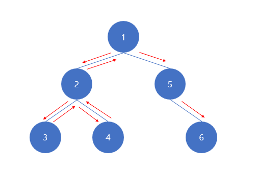 위 그림에서 각 노드의 번호는 탐색 순서를 뜻한다. 1번 노드는 2, 5번 노드를 자식으로 가진다. 하지만 2번 노드가 자식 노드를 가지기 때문에 5번 노드를 탐색하기 전 3, 4번 노드를 우선 탐색한다. 2번 노드에 다른 자식 노드가 없기 때문에 다시 5번 노드를 탐색하는 형태이다.
