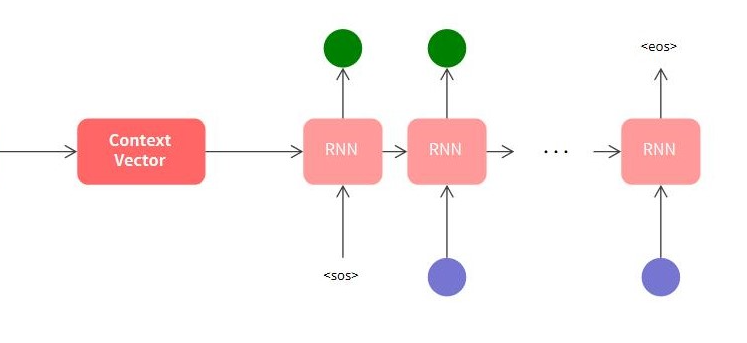 Decoder는 압축된 context를 이용해 결과를 예측한다. Decoder도 RNN으로 구성되어 있다. 첫 RNN 은닉층 벡터로 Context Vector를 사용한다. 그리고 첫 RNN은 <sos>를 입력으로 받는다. 마지막 RNN은 <eos>를 출력한다. <sos>와 <eos>는 시작과 끝을 알리기 위해 약속된 벡터다.
