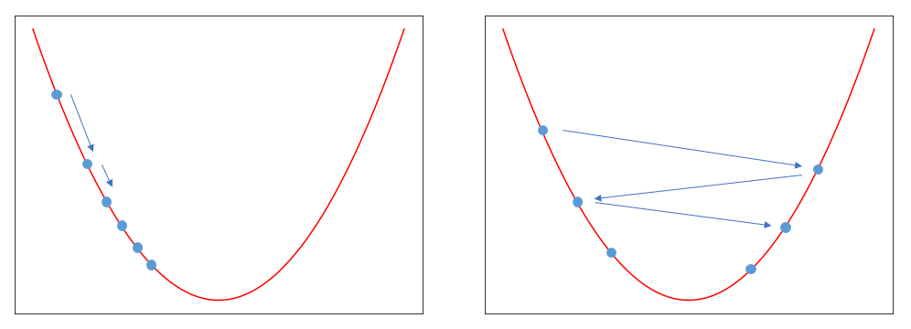 E(w)는 오차를 계산하는 비용 함수(목적 함수)이며, w는 오차를 구하는 과정에서 사용된 가중치이다. t 시점의 w에 대해 편미분한 값을 빼서 t+1 시점의 w를 구하는 과정을 식으로 나타낸 것이다. 미분 값 앞에 곱해져 있는 상수는 학습률(learning rate)이다. 학습률이 작으면 왼쪽 그래프처럼 값이 천천히 변하고, 학습률이 크면 오른쪽 그래프처럼 큰 보폭으로 움직인다.
