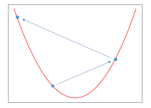 그런데 단순히 미분값만 뺀다고 최솟값에 도달하지는 않는다. 간단하게 그림으로 그려보면 좌우로 움직였지만 오히려 최솟값에서 더 멀어지는 경우다. 이 과정을 반복하면 값이 저 멀리로 날아가 버린다.