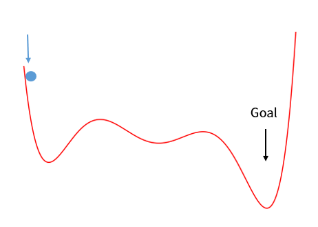 똑같은 게임이지만 이번에는 더 복잡한 맵을 가지고 왔다. 우리가 찾고 싶은 최솟값은 오른쪽 끝에 위치한다. 만약 공을 아주 약하게 민다면 첫 번째 골짜기에 빠져서 그래도 멈춰버린다. 공을 애매하게 밀면 두번째 골짜기에서 멈춰버릴 수도 있다.