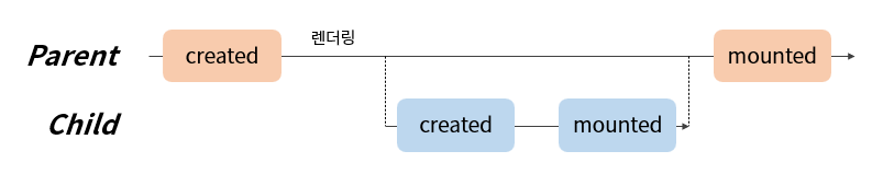 주의할 점은 Parent와 Child 컴포넌트에 모두 mounted가 있을 때, Child → Parent 순서로 mounted가 실행된다. 순서를 간략화하면 아래와 같다.