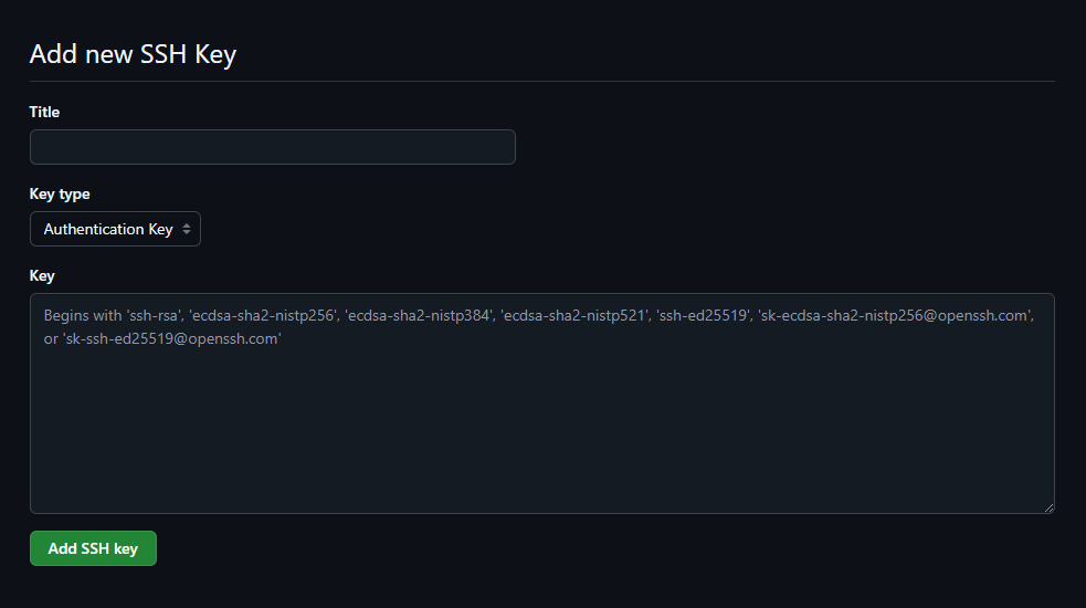 Github 설정 > SSH and GPG keys > New SSH Key를 클릭해 복사했던 키(id_rsa.pub)를 붙여넣는다. Title은 자유롭게 설정하면 된다.