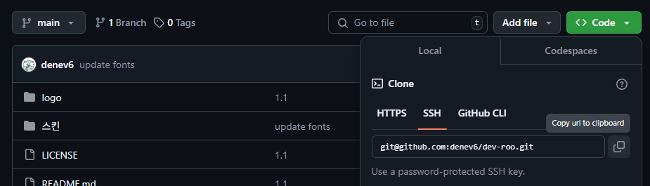 "git@github.com: ..." 부분은 저장소 Code > Clone SSH에서 복사할 수 있다. 참고로 Bash에서 붙여넣기는 Shift + Insert다.