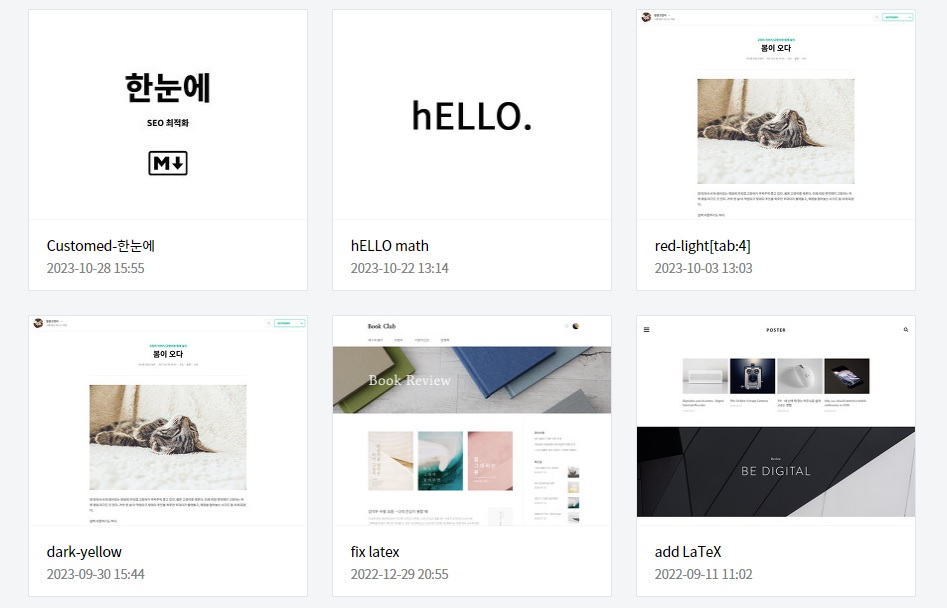 커스텀하면서 배운 노하우를 적어보려 한다. 모두 개발 블로그로 사용했고, 코드 + 수식 + 글이 주를 이룬다.