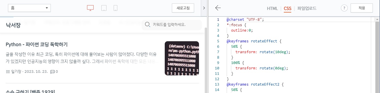 티스토리는 HTML/ CSS 레벨에서 직접 수정한다. html 편집을 누르면 코드가 나온다.