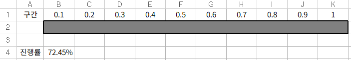먼저 10칸짜리 셀을 색칠해서 준비해주고, 셀 위에 0.1, 0.2, 0.3 ... 1을 적어준다. 만약 퍼센트가 위에 적힌 구간을 넘어가면 아래 셀이 채워지는 식이다. 조건부 서식을 이용해 조건을 만족하면 셀 배경색을 바꾸는 식으로 구현해 보자.