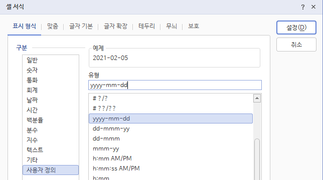 셀을 우클릭하면 셀 서식을 볼 수 있다. 셀 서식 > 표시 형식은 데이터를 어떤 형식으로 표시할지에 대한 설정이다.