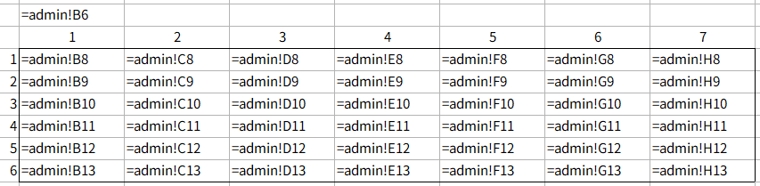 글 초반에 이야기했지만 새로운 시트를 만들어 달력을 참조해 가져오기로 했다. 달력은 "admin" 시트에 만들었고 위 이미지에서 볼 수 있듯 B6에 제목이 있고, B8부터 7x6 달력이 위치한다. 따라서 아래와 같이 참조한다.