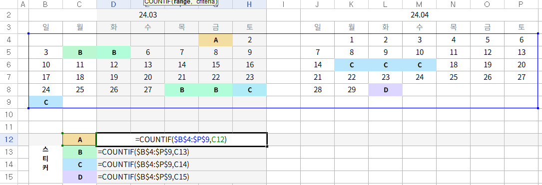 그리고 COUNTIF로 사용한 스티커를 셀 수 있다.