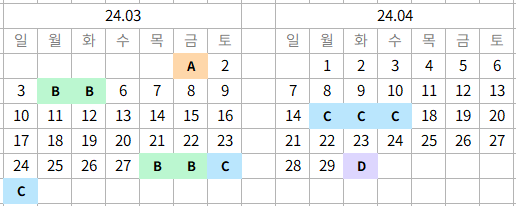 일정을 기록할 수 있는 달력이다. 달력은 크게 admin 시트와 main 시트로 나뉜다. admin은 달력 생성 코드를 포함한 달력에 필요한 모든 정보를 담은 시트다. 반면 main은 사용자가 직접 값을 수정하거나 admin에서 계산된 정보를 보여주는 공간이다. 이렇게 시트를 분리한 이유는 달력 원본을 보존하기 위해서이다. 달력에 직접 정보를 작성하면 달력이 훼손된다. 시트를 분리해 사용자가 수정할 수 없는 부분과 사용자가 수정 가능한 범위를 나누었다. 쉽게 backend와 frontend라고 생각하면 된다.