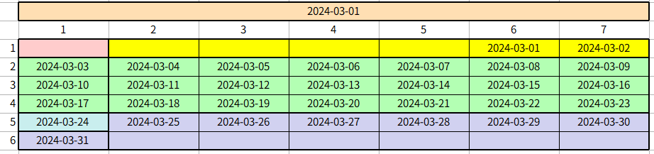 달력 내부는 7x6 크기로 크게 다섯 부분으로 나뉜다. 가이드 이미지를 보면 각 부분을 색으로 구분해뒀다. 셀은 이후 "d" 형식으로 표시해 일자만 노출한다. 본 글에서는 이해를 돕기 위해 "yyyy-mm-dd" 형식으로 두고 개발을 진행하겠다. 참고로 일요일부터 시작하는 달력 기준으로 설명하며 (행, 열) 표기를 사용한다.