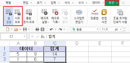 한셀의 경우, 보호할 셀을 선택한 후 셀 잠금을 해준다. 반대로 값을 입력해야하는 셀은 잠금을 풀어준다. 그리고 시트 보호를 설정하면 함수를 안전하게 유지할 수 있다.