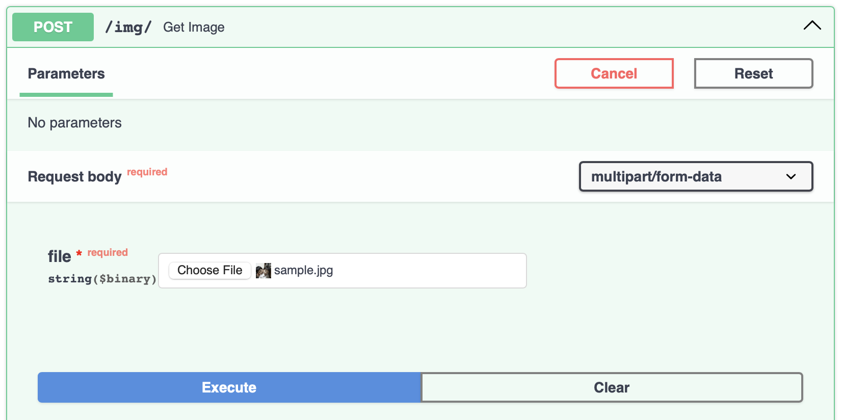 해당 API를 찾아 "Try it out"을 누르고, 이미지를 선택한 다음 "Execute"하면 POST 요청이 실행된다. 아래로 내려오면 response를 확인할 수 있다. 이미지가 잘 전달된 것을 볼 수 있다.