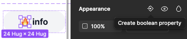 만약 버튼 앞에 아이콘을 추가하고 싶다고 하자. 그런데 어떨 때는 아이콘이 필요하고 어떨 때는 필요하지 않다. 그렇다면 버튼 컴포넌트를 삽입할 때 아이콘을 숨길지 말지 옵션을 추가할 수 있다. Appearance 옆 마름모 아이콘에 마우스를 올리면 "Create boolean property"라는 문구가 뜬다. 이 버튼을 클릭하면 아이콘을 프로퍼티로 등록할 수 있다.