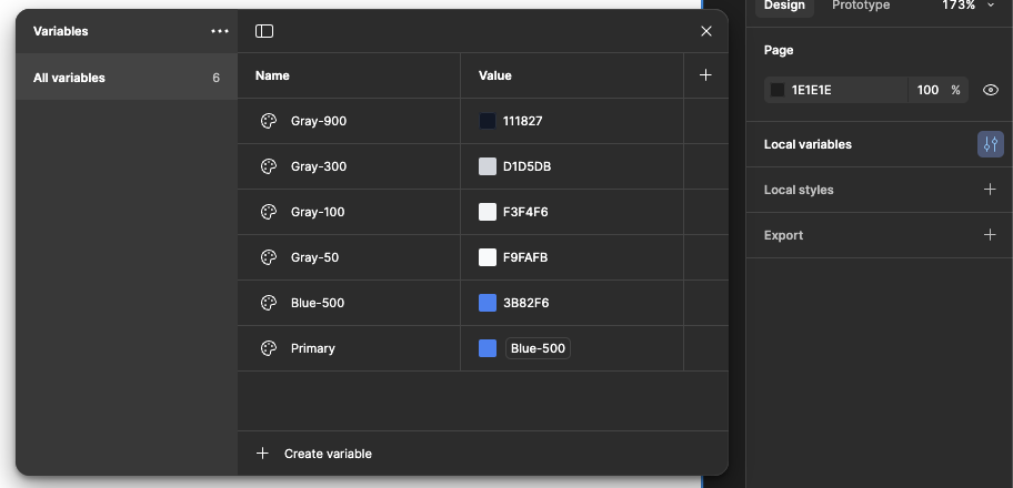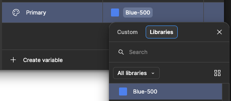 value를 선택할 때 Libraries를 선택하면 앞서 만들었던 변수를 연결할 수 있다. 이 기능을 이용하면 #3B82F6 = Blue-500 = Primary와 같이 변수를 연결할 수 있다.