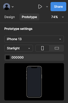 우측에 Prototype을 선택하면 원하는 기기와 옵션을 선택할 수 있다. 상단의 플레이 버튼을 누르면 프로토타입이 나타난다. 이 기능을 활용하면 버튼의 클릭이나 스크롤 등 동작도 등록할 수 있다. 클릭하면 다음 페이지로 이동하는 버튼을 만들어보자.