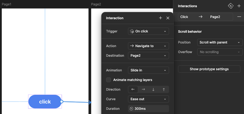 버튼을 선택하고 Interactions를 추가하면 동작을 등록할 수 있다. 위 예시는 클릭(on click)되었을 때 "Page2"로 이동(navigate)하는 예시다. 애니메이션이나 방향, 커브 등도 설정 가능하다.