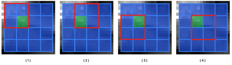 빨간 테두리는 현재 단계에서 정규화가 진행되고 있는 block 크기의 구역을 나타낸다. 초록 색으로 표현한 cell은 총 4번의 정규화에 영향을 준다. 다른 cell도 중복으로 총 4번의 정규화에 사용된다.