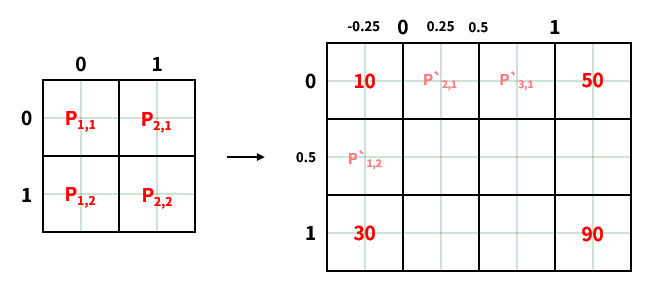 가로 행에 4개의 픽셀이 할당되어야 한다. 따라서 같은 거리로 값을 배치하다 보니 $P_{2,1}'$는 $(0.25, 0)$에 위치하게 된다. 이 가정을 바탕으로 $P_{2,1}'$을 계산해 보자.