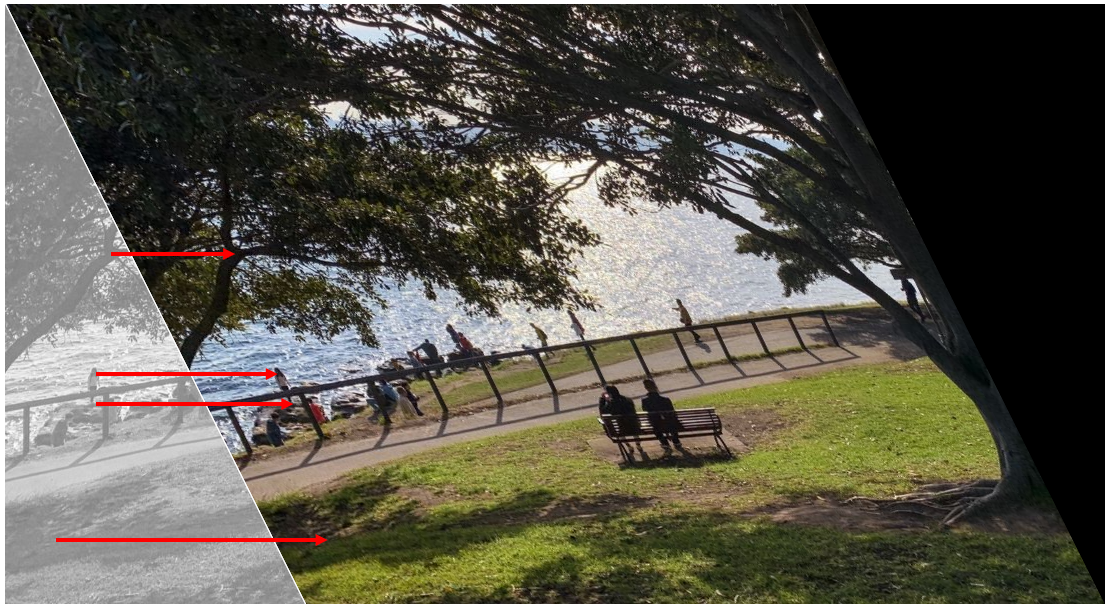 $M_{trans}$는 3 x 3 변환 행렬이다. $w$는 이미지를 조정하기 위한 scale factor이다. $M_{q}$는 최종 목표 좌표인 $q$를 담고 있는 행렬이다. $M_{q}$는 변환 행렬 벡터를 담고 있는 8 x 1 크기의 $M_{trans}'$과 8 x 8 행렬 $M_{coef}$로 나타낸다. 여기서 LU-decomposition 등 방법으로 $M_{coef}$를 분해한 뒤, $M_{trans}'$를 구한다. $M_{trans}'$를 3 x 3 행렬로 매핑하면 변환 행렬 $M_{trans}$를 얻을 수 있다. 참고로 $M_{trans}$ 내 마지막 값은 1로 고정이기 때문에 8 x 1 행렬을 3 x 3으로 매핑하는 것이 가능하다.