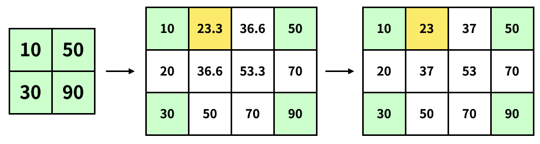 예를 들어, 2 x 2 이미지를 4 x 6 이미지로 늘리려 한다. 기존 이미지는 4개의 픽셀(정보)만 가지고 있지만, 확대한 이미지는 24개의 픽셀을 가진다. 이때 발생한 공백을 채우는 방법이 보간법(interpolation)이다.