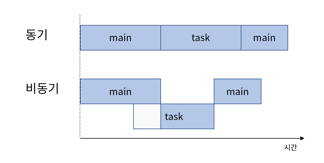 동기와 비동기 방식을 간략하게 표현하자면 위 그림과 같다. main 작업이 진행되는 동안 동시에(concurrent) 다른 작업이 진행될 수 있는 것이다. (단, 동시에 처리되는 것이지 병렬적으로 처리되는 것은 아니다.)
