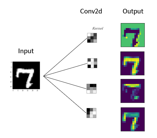 위 예시는 흑백 이미지를 입력으로 받으므로 in_channels는 1이며, 출력으로 4개의 Feature map이 만들어지므로 out_channels가 4인 예시다. Conv2d에서는 (out_channels, in_channels) 크기의 Kernel을 만들어 out_channels개의 출력을 만들어낸다.