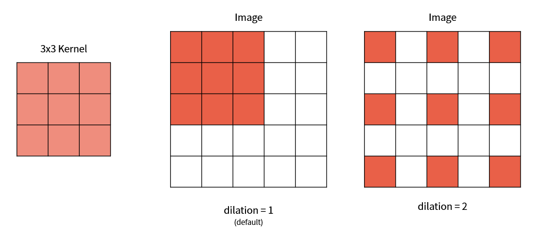 dilation 값을 늘리면, 이미지를 탐색할 때 Kernel 값들의 사이 간격이 커진다. 기본값은 1로 설정되어 여백 없는 Kernel의 형태로 탐색된다. dilation이 2인 예시를 보면 (3 x 3) 크기의 Kernel을 이용해 (5 x 5) 크기의 Kernel이 커버하는 범위를 탐색하고 있다. Dilational Conv는 이미지를 넓은 범위로 탐색해야 하거나 큰 Kernel을 사용할 여유가 안 될 때 연산 효율을 높이는 효과를 얻을 수 있다.