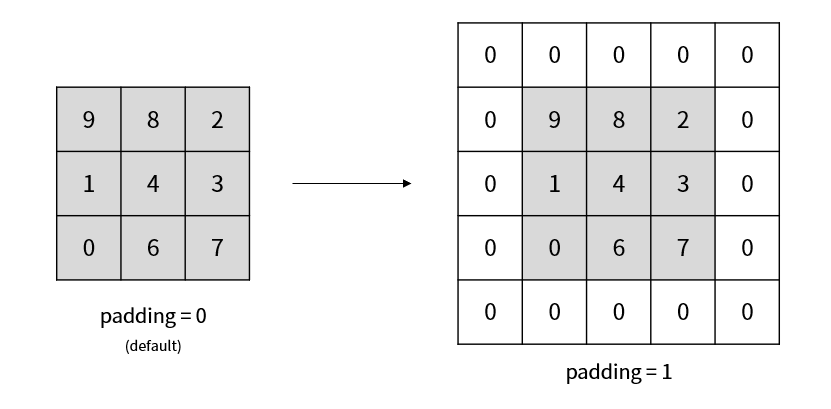 padding이란 MaxPooling을 수행하기 전 가장자리에 0 값을 추가하는 것을 뜻한다. Pytorch의 경우, 0 값을 채우는 zero-padding을 수행한다.