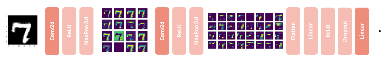 위에서 봤던 Conv2d + ReLU + MaxPool2d, Flatten + Linear + Dropout을 모두 적용한 모습이다. 완성된 모델의 구조는 아래와 같다. 학습이 잘 되는지 확인하기 위해 channel과 같은 값들은 임의로 설정하였다.