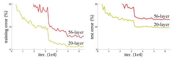 하지만 degradation 문제도 발생한다. 정확도가 낮아지지 않고 training error가 얕은 모델보다 크다.