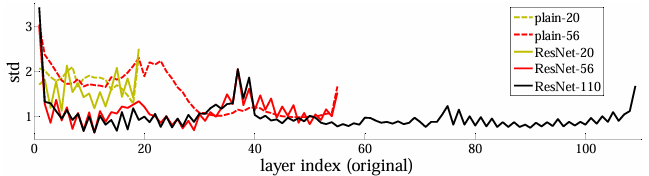 출력은 3x3 conv + 정규화 결과로, 비선형 함수(ReLU)를 거치기 전이다. ResNet이 Plain 모델보다 작은 반응을 보였다. 이는 residual 함수가 0과 가까운 값($\mathcal{F}$)을 낼 것이라는 가정을 증명한다. 또 레이어가 많을수록 각 레이어는 큰 변화를 보이지 않았다.