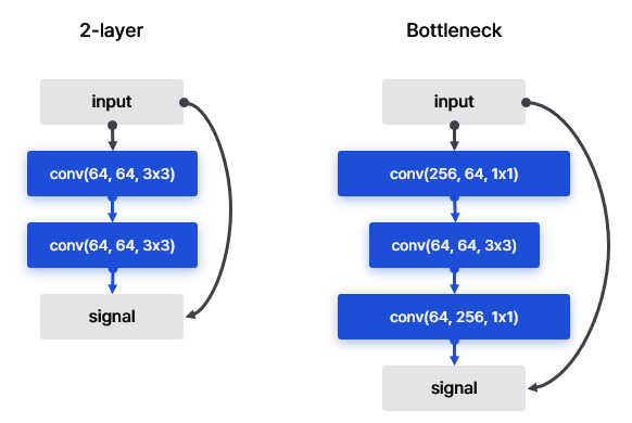 첫 1x1 conv는 차원을 압축(또는 유지)하고, 마지막 1x1 conv는 차원을 복원한다. 이 구조에서 projection을 사용하면 모델 복잡도가 커진다. 따라서 identity shortcut이 더 효율적이다.