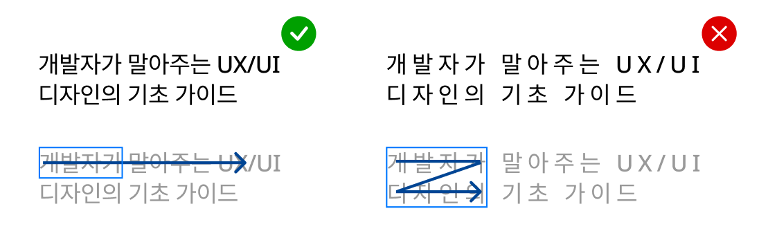 자간(letter-spacing)은 글자와 글자 사이 간격이다. 행간에 비해 자간이 넓어지면 글자가 잘못 묶여보이는 현상이 나타난다. 반대로 자간이 좁으면 글자가 겹쳐보이는 현상이 생길 수 있다. 따라서 행간을 수정한 후 자간도 확인해야 한다.