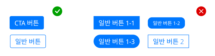 대표적인 실수로 버튼을 불필요하게 여러 가지로 가져가는 경우가 있다. 페이지 이동 버튼과 CTA 버튼을 다르게 가져간다면 문제가 되지 않는다. 그런데 같은 맥락의 버튼임에도 조금씩 다른 스타일을 적용하는 경우가 있다. 이럴 때는 스타일을 통일해주는 것이 개발자 정신건강에 좋다.
