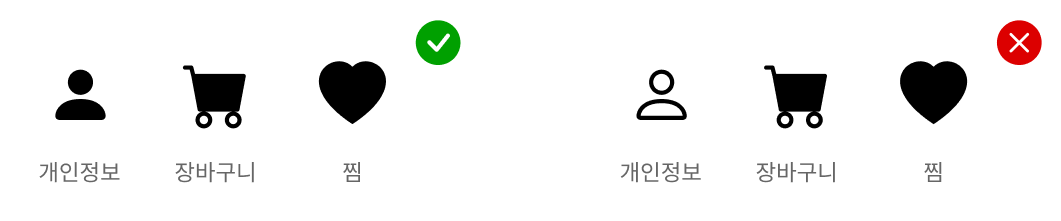 같은 아이콘도 여러 스타일이 있다. 이때 아이콘 스타일은 통일해줘야 한다. 아이콘 스타일마다 무게감과 부피감이 다르기 때문이다.