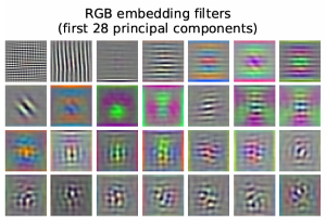 첫 레이어는 이미지를 저차원으로 매핑시킨다. 위 이미지는 학습된 필터 중 PCA를 통해 찾아낸 주요 28개 필터 모습이다. 이미지 patch에서 구조를 찾아내기 위한 모양으로 보인다.